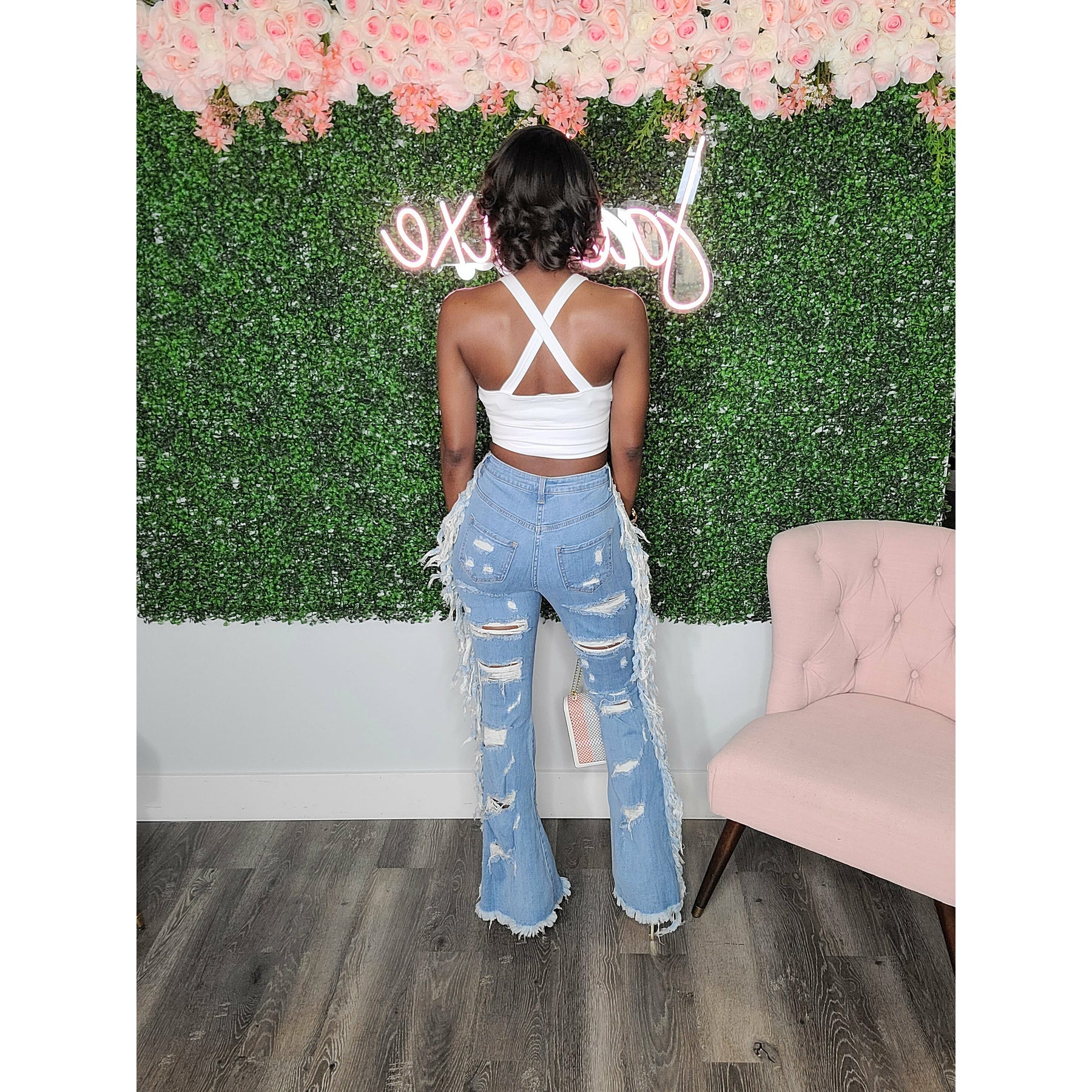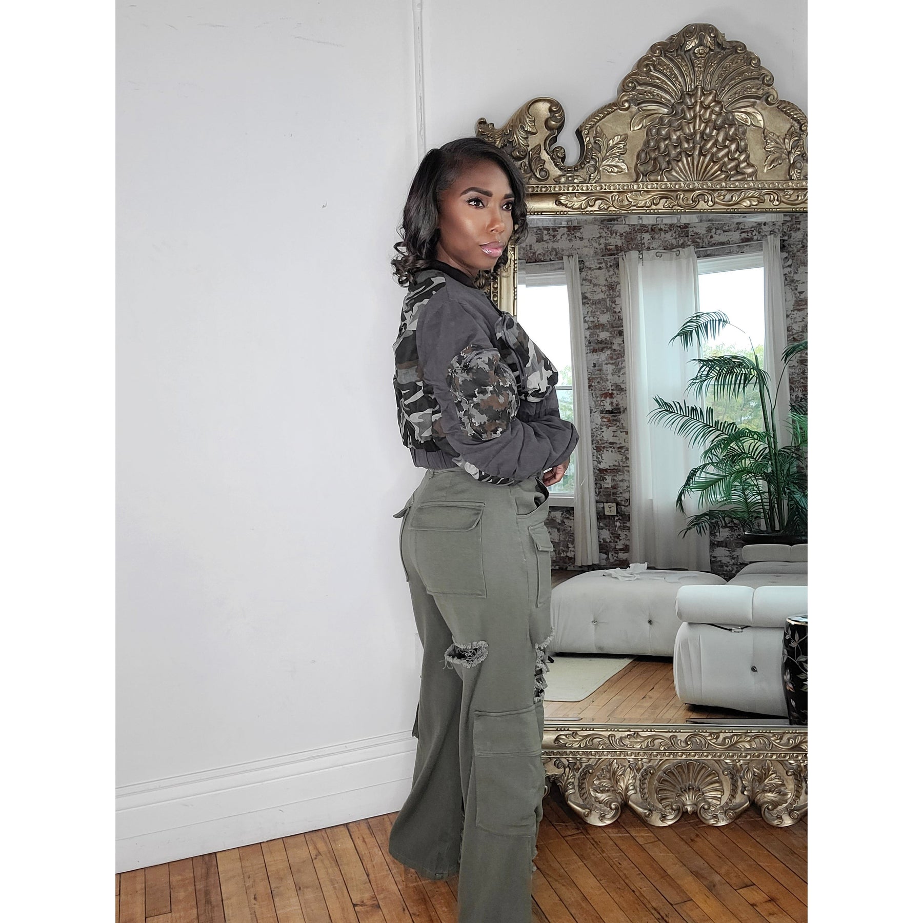 Add some edgy style to your wardrobe with Distressed Denim Wide Leg Cargo Pants! Featuring front and side pockets and distressed detailing at the front, these cargo pants offer a high rise waist with a button zipper closure and a wide, flared leg opening. Look great and stand out with these stylish cargo pants! Runs slightly big. 82% Cotton, 15% Tencel, 3% Spandex.